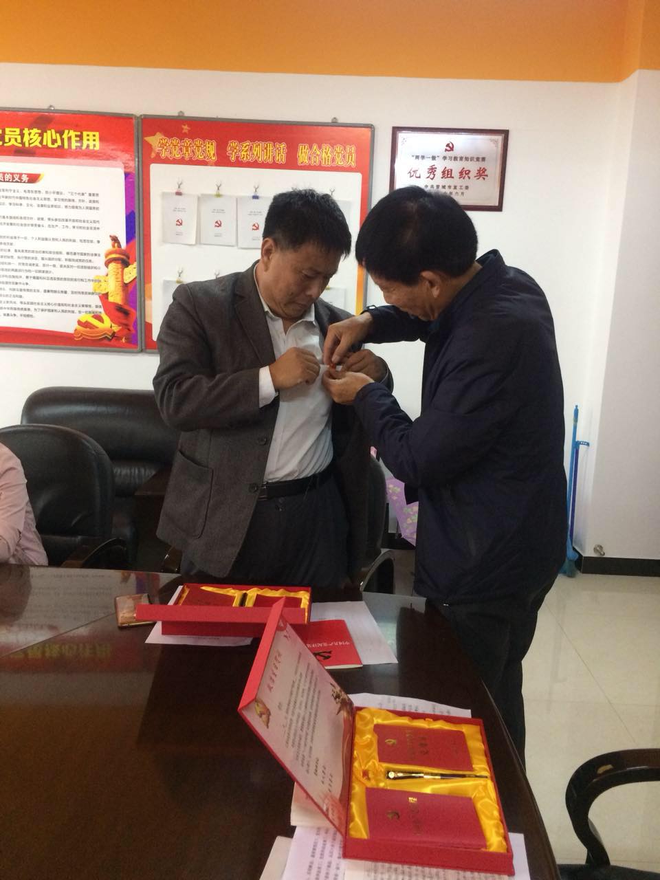 公司黨支部李書記為黨員佩戴黨徽、頒發(fā)政治生日盒及宣讀賀詞。