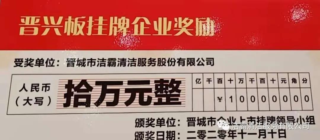 晉城市潔霸清潔服務股份有限公司于2019年11月27日成功登陸山西股權(quán)交易中心“專精特新板”(晉興板)(企業(yè)代碼:060200Z),是“專精特新板”開板暨首批掛牌的14家企業(yè)之一。“專精特新板”是山西股權(quán)交易中心設(shè)立的特色板塊,為省內(nèi)具備專業(yè)化、精細化、特色化、新穎化的優(yōu)質(zhì)企業(yè)提供專屬服務,成為帶動全省中小企業(yè)創(chuàng)新創(chuàng)造、轉(zhuǎn)型升級,壯大工業(yè)高質(zhì)量發(fā)展的生力軍!皶x興板”掛牌,標志著公司正式進軍資本市場,豐富了融資渠道,推動公司高質(zhì)量轉(zhuǎn)型發(fā)展,成為公司發(fā)展的新引擎。