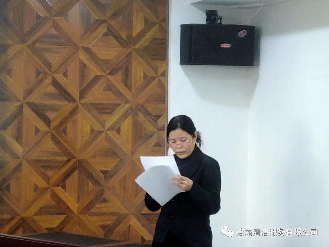山西潔霸物業(yè)管理有限公司經(jīng)理李廣忠、會計張青霞、出納王頓花、晉城市合眾力勞務(wù)派遣有限公司經(jīng)理成濤、出納劉雨星、晉城市潔霸清潔服務(wù)股份有限公司工程部文員張陽楠、綜合辦公室車輛管理員呂衛(wèi)東、人力資源部文員呂利清、山西百潔物業(yè)服務(wù)有限公司出納王笑依次上臺作了述職匯報。