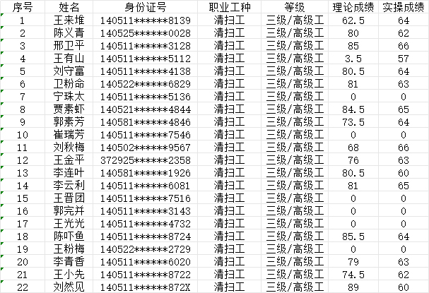 晉城市潔霸清潔服務股份有限公司職業(yè)技能等級認定中心現將2024年6月23日認定人員成績公示如下:
