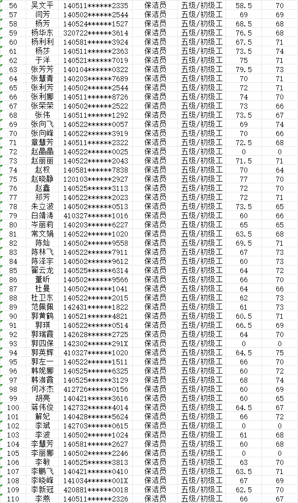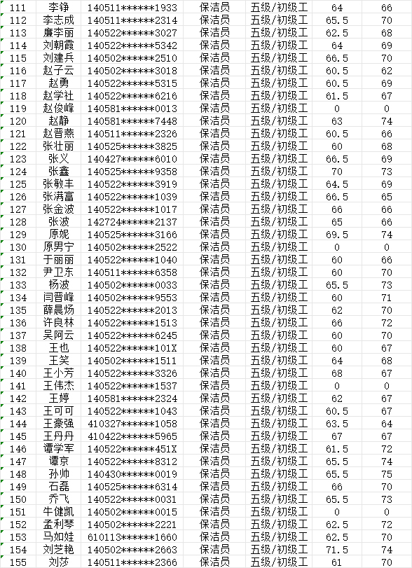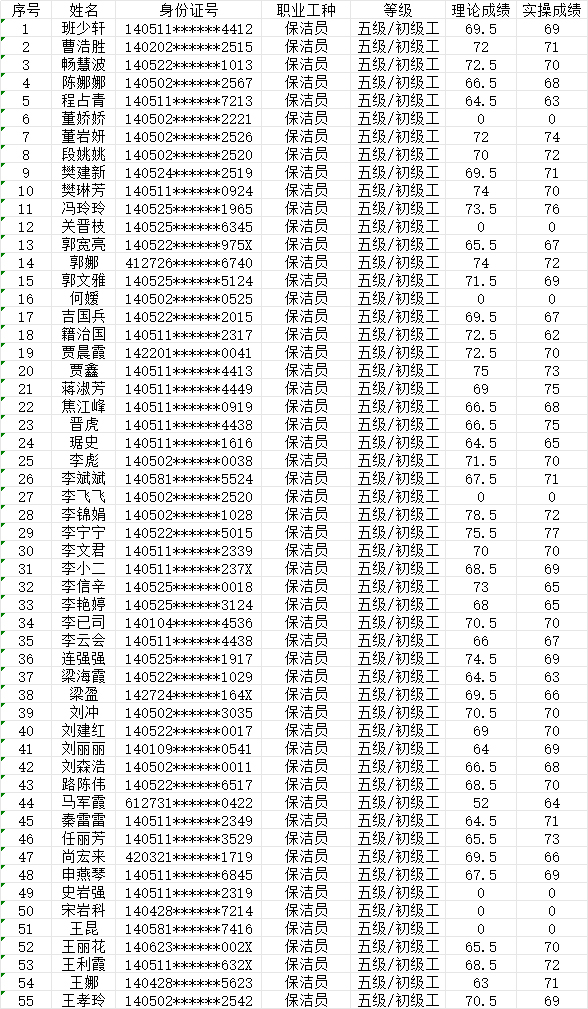 晉城市潔霸清潔服務(wù)股份有限公司職業(yè)技能等級認(rèn)定中心2024年7月27日第25批保潔員初級認(rèn)定人員成績公示