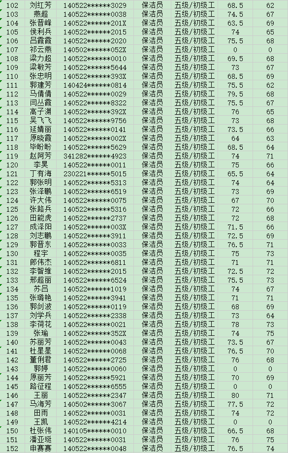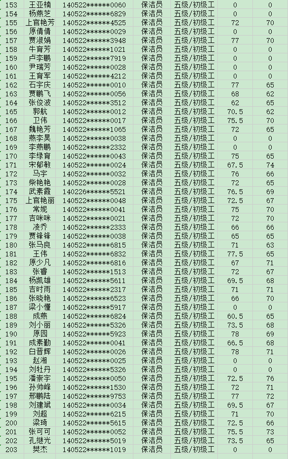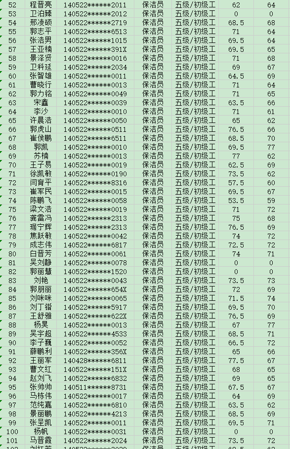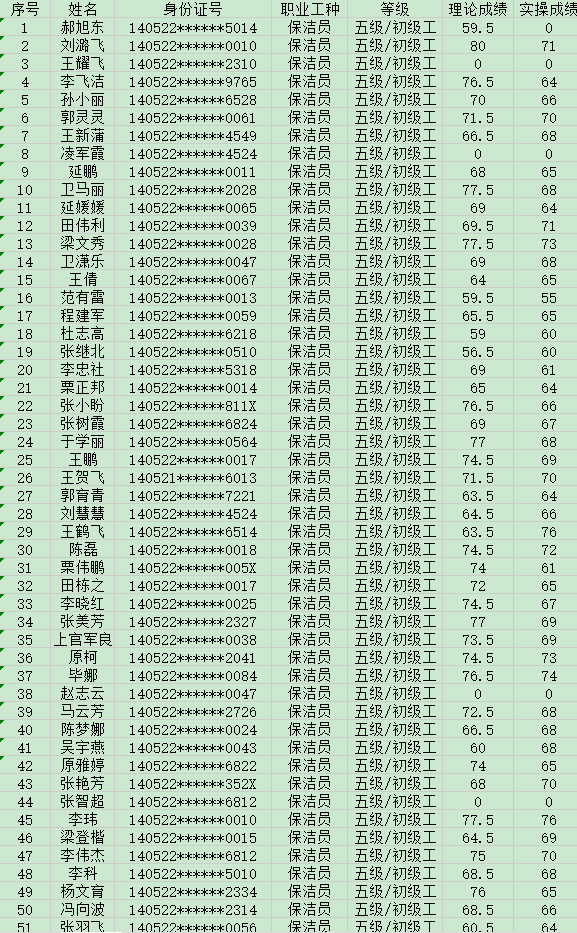 晉城市潔霸清潔服務(wù)股份有限公司職業(yè)技能等級(jí)認(rèn)定中心現(xiàn)將2024年8月17日認(rèn)定人員成績公示如下:
